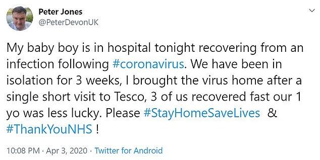 这位男子名叫彼得·琼斯,来自英国的德文郡。他在自己的推特上透露,自己去了趟超市居然把病毒带回了家,虽然有3名家庭成员很快康复了,但是还在襁褓里的儿子就没那么幸运了,不得不送医治疗。