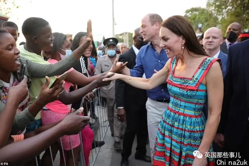 两人当天还参观了一个叫Trench的小镇,那里是雷鬼传奇音乐人鲍勃·马利(Bob Marley)的故乡,凯特换了一条活跃的条纹无袖连衣裙,遭到热心欢送,现场氛围十分好。