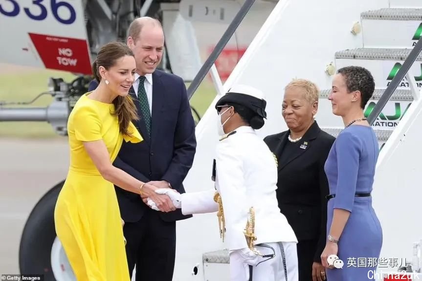 威廉和凯特在勾销一项行程的状况下,实现了三天的伯利兹之旅,第二站他们到达牙买加,没想到,这次等着他们的是更大的支持声浪。周二,威廉和凯特坐专机到达牙买加,威廉身穿深蓝色西装,凯特穿了一条黄色连衣裙,走下飞机时满面春风。