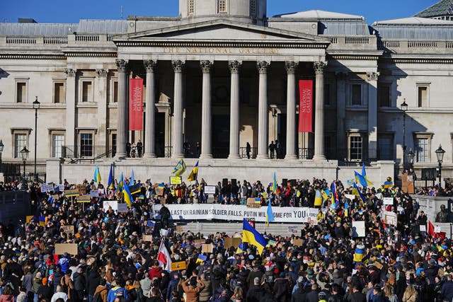 抗议者手持乌克兰国旗和口号,下面写着住手普京的和平、禁飞区和与乌克兰站在一同,游行队伍浩浩荡荡的向特拉法加广场后退。