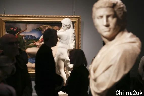 2017年,在美国纽约大都会博物馆举办的米爽朗基罗艺术展上,参观者观看米爽朗基罗的两座雕塑作品。