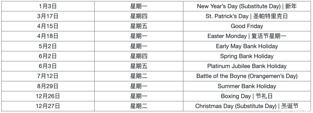 2022年北爱尔兰地域Bank Holiday支配如下:
