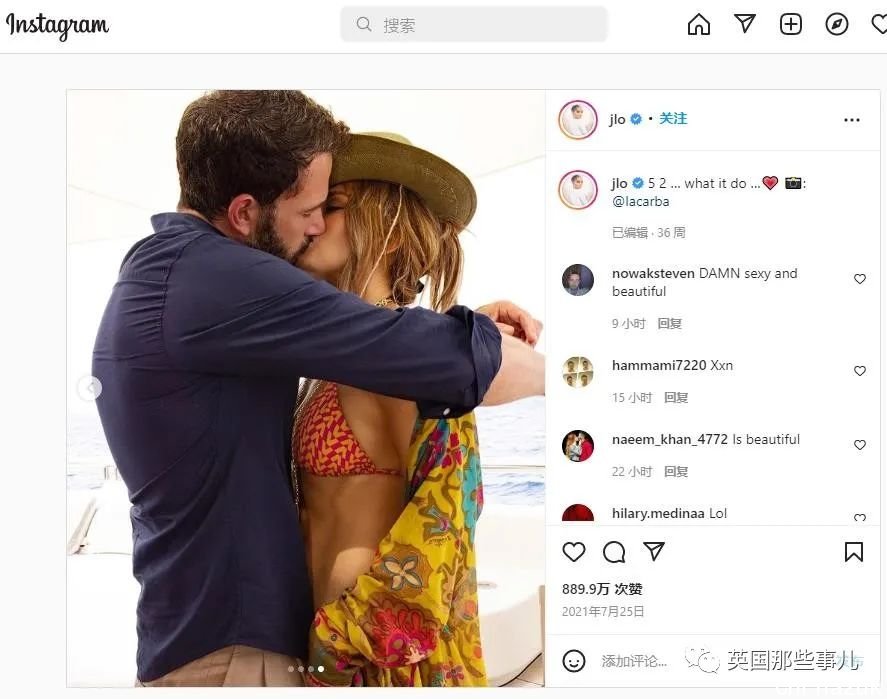 7月,J Lo在Instagram晒亲吻照,正式官宣爱情。
