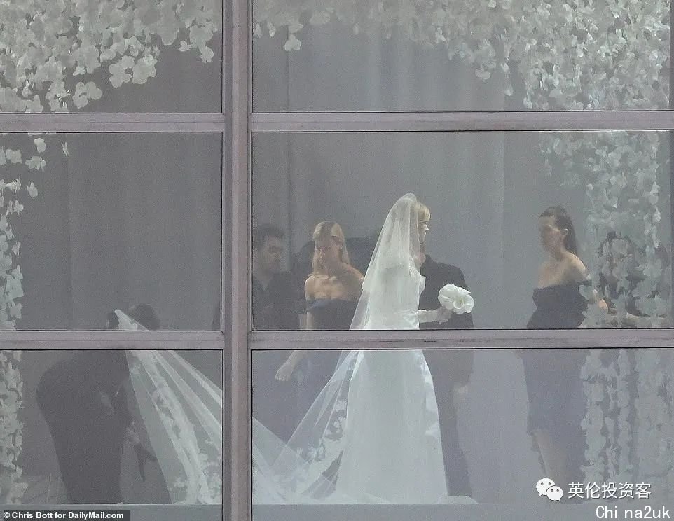 婚礼当天,新娘穿戴Valentino定制婚纱,华贵异样。听说,为了包管婚纱完善合身,她两次飞去罗马与设计师商讨细节。