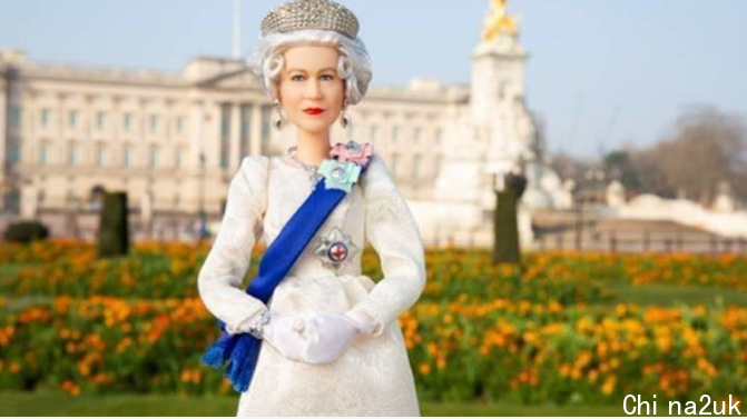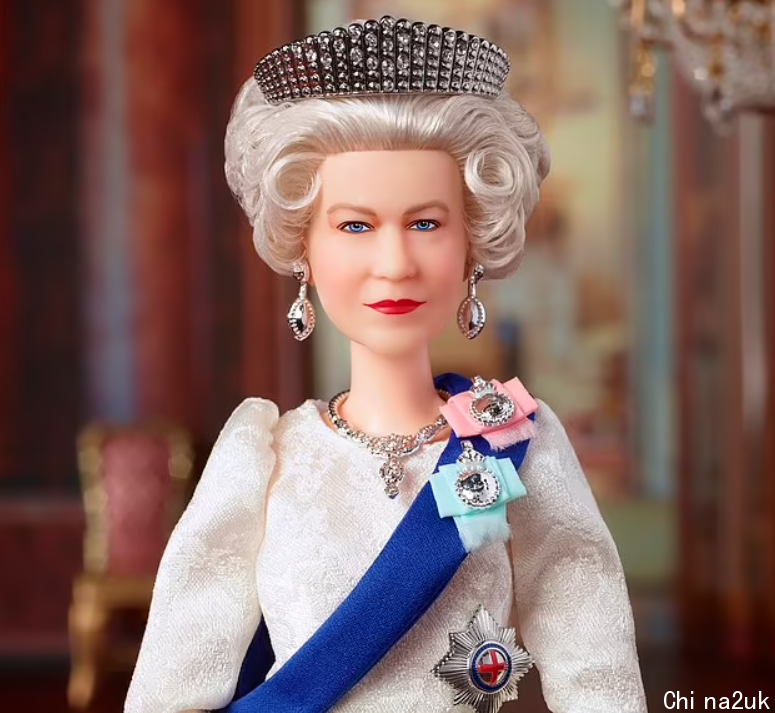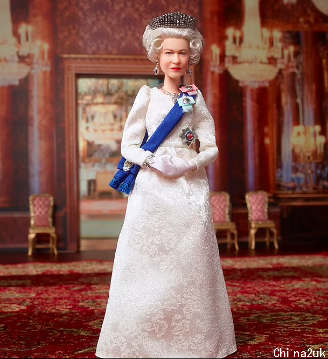 女王芭比娃娃身着优雅的象牙色长袍和佩戴蓝色绶带。以2019年6月女王在白金汉宫欢送川普夫妇时的着装为根底原型。