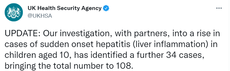 截止2022年1月1日至4月十二日,英国受不明缘故急性肝炎发作影响的幼儿人数已回升至108人。除了英国卫生平安局上周发布的74例病例以外,又新增了34例病例。