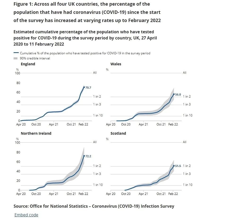 2020年7月27日至2022年2月十一日之间,北爱尔兰有130万感染,占地域人口的72.2%;
