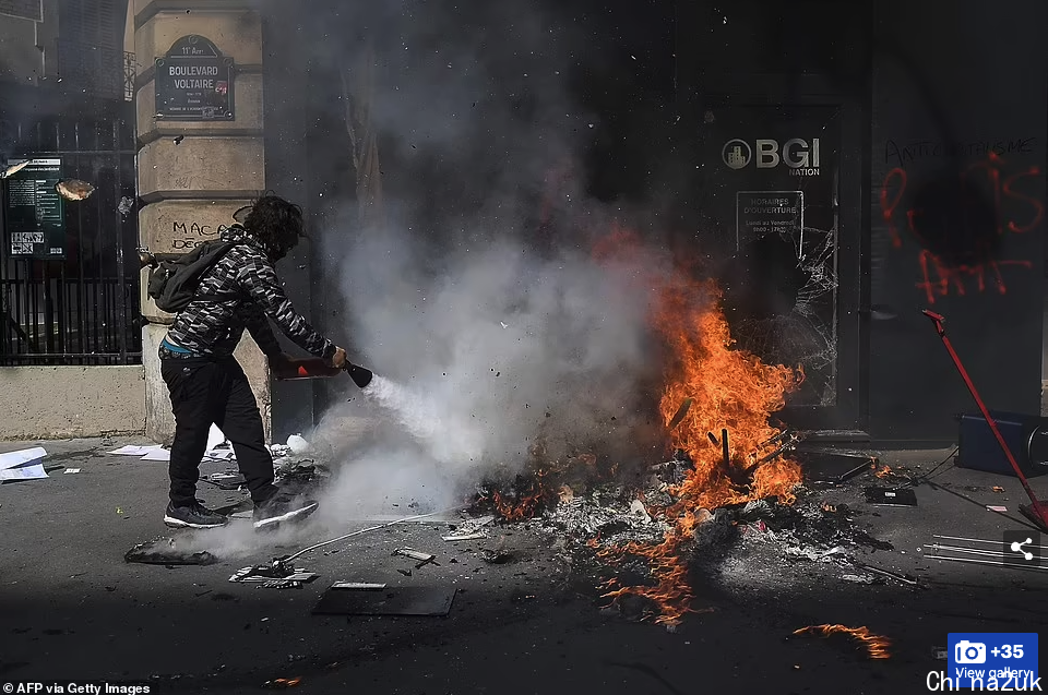 在巴黎的民族广场,丧心病狂的抗议者把烟花扔进麦当劳店里,整间店铺被炸穿,店门玻璃被砸毁,全部店里在歹徒的攻打上面目全非!