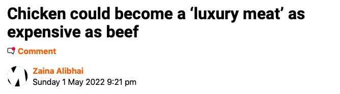 本钱涨幅也影响了Nando’s和肯德基KFC在内以鸡肉为次要食材的餐厅,它们在比来几个月里都进步了菜单价钱。