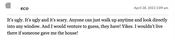 “它既漂亮又可怕。任何人均可以在任什么时候候走下来间接看就任何一扇窗户。我敢斗胆猜测,的确有人去看!呵。假如有人把房子给我,我也不会住在那里!”