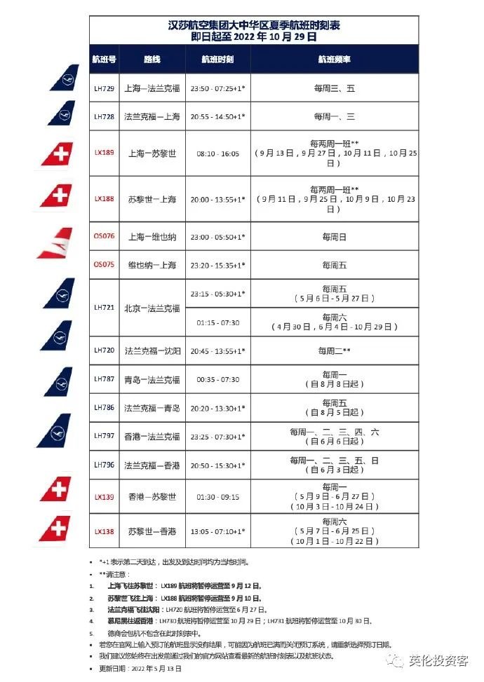针对上海来回苏黎世的下一次航班方案,上海飞往苏黎世的 LX189 航班方案将于2022年9月13日腾飞,而苏黎世飞往上海的 LX188 航班方案将于2022年9月十一日腾飞。从2022年9月起,瑞士国内航空临时方案每两周执飞一次上海来回苏黎世的航班。上面另附瑞航/汉莎团体至10月29日的夏季航班时辰表: