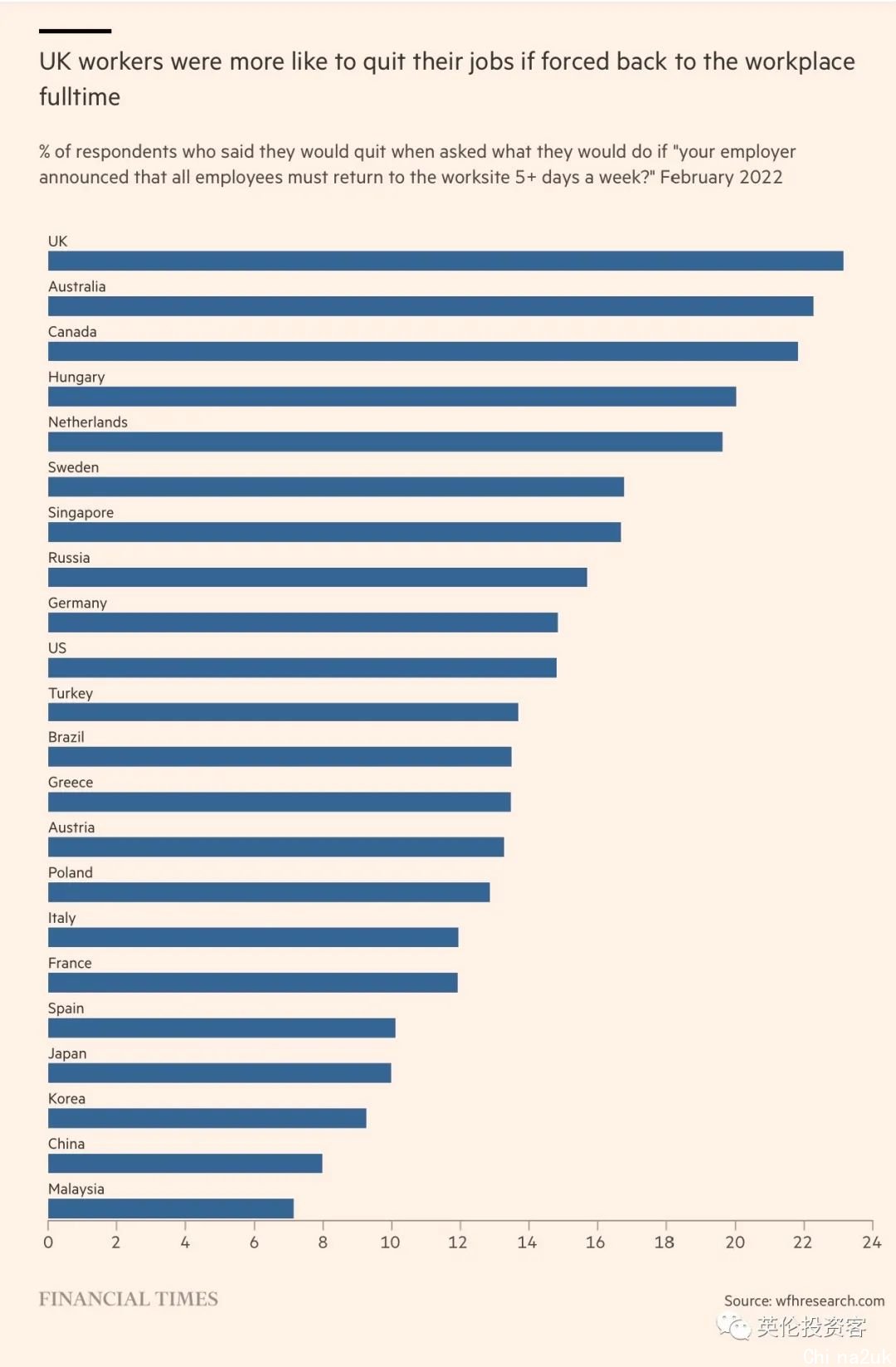 Freespace的数据发现,5月第一周,英国的办公室使用率约为30%,是疫情前的一半。往年2月,北美多所大学旗下机构WFH Research对3.3万人进行的寰球考察显示,英国人每周在家任务的天数是欧洲至多的。考察还发现,与其余欧洲国度的人比拟,英国员工中表现“假如自愿回到办公室全职任务就会辞职”的比例最高。