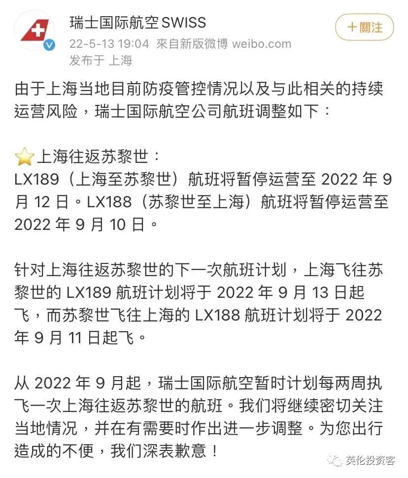 瑞士国内航空暂停苏黎世-上海来回航班至9月中旬5月13日,瑞士国内航空民间微博宣告——因为上海本地目前防疫管控状况以及与此相干的继续经营危险,瑞士国内航空公司航班调剂如下:LX189(上海至苏黎世)航班将暂停经营至2022 年9月十二日。LX188(苏黎世至上海)航班将暂停经营至2022年9月10日。
