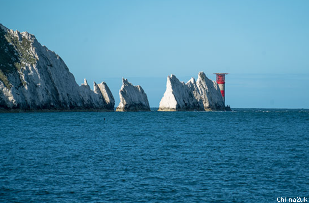 在怀特岛最西角,有一个怀特岛最著名的景点—The Needles。汹涌的波浪中屹立着三块狭长的红色悬崖,悬崖始终延长至海面,三点成一线,好像一根针,所以叫The Needles。