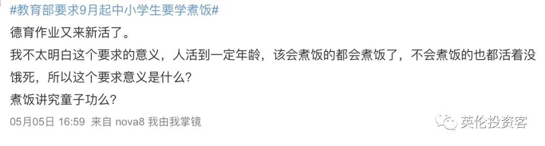 2022年5月6日,中国《义务教育休息课程规范(2022年版)》出炉,该文件公布后,话题#教育部要求9月起中小先生要学烧饭#当即就冲上了微博热搜榜第一位。
