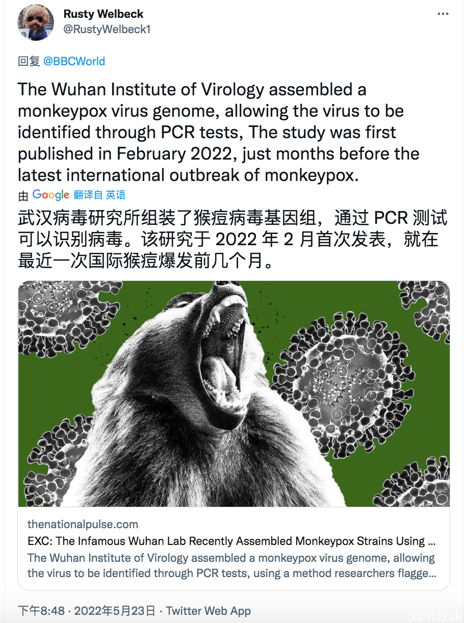 当有人在疏导言论向美国看齐的时分,谎言制作者们也不忘给武汉多戴一顶帽子。名为“The nation al pulse的网站间接就剑指武汉病毒钻研所组装了猴痘病毒,理由是在病毒发作前该试验室正进行辨认病毒的钻研测试。但由于以前新冠病毒等诱发系列“武汉诡计论”曾经让大家发生“免疫”,所以网友对这条新大陆不是很感冒。