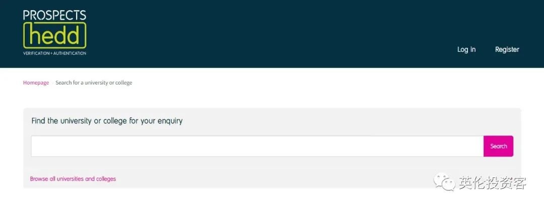 第二个网站是英国Hedd查问零碎,链接如下:https://hedd.ac.uk/search_university_or_college.htm如下图所示,在搜寻栏输出学校的名字,可以看到该名字和一切名字类似的学校。