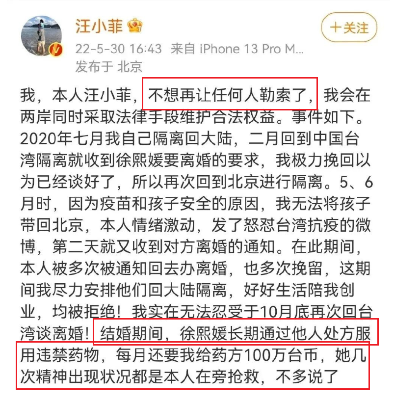 汪小菲见图忽然怒了,开始暴走微博,指称大S婚姻期间长时间服用禁药,为此他每月需求领取100万台币。