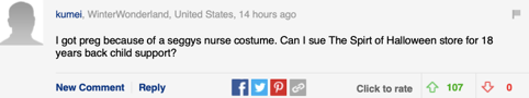 “18年前,我由于穿了一身护士cos装怀孕了。所以,18年后,你们是告知我能够去起诉那间名字叫’万圣节灵魂’的店铺索要抚育费了么?”