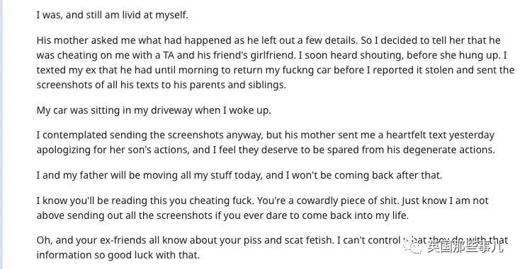 “我过后,甚至到当初,都十分生本人的气。他妈妈问我产生了甚么,由于他漏掉了一些细节,所以我抉择把他和助教以及敌人的女敌人出轨的事都告知她。很快,我就听到了喊叫声,而后她挂断了电话。我给我后任发了动静,要求他在今天早上以前把车子还给我,不然我就要以偷窃罪报警,而后,我又把他一切的短信截图都发给了他的父母还有兄弟姐妹。当我醒来时,车子曾经停在了我的车道上。我斟酌过无论如何都要把截图收回去,但他妈妈昨天给我发了一条十分诚心的短信,为她的儿子报歉,我感觉他们不该该被他腐化的行动株连。我和我爸明天会我一切的货色搬走,之后不会再来了。(To后任)我知道你会读这个帖子,你是个该死的骗子,懦弱的废料。假如你胆敢再次踏进我的糊口,我就会把一切的截图都收回去。还有,你的前敌人们当初都知道你对尿液和粪便有特殊嗜好了,我可不克不及管制他们会拿这些信息做甚么,祝你好运吧。”