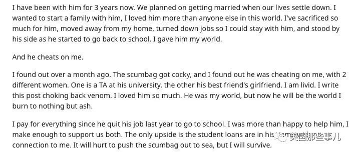 “我和他在一同3年了。咱们已经方案等糊口安宁上去就结婚。我想和他组建一个家庭,我对他的爱胜过这个世界上的任何人。为他,我就义了得多,不只从本人家搬出去,还回绝了任务时机,就是为了能和他在一同。当他抉择持续回学校上学时,我坚决地反对着他,把我的整个世界都给了他。可他,却变节了我。大略一个多月前,我发现事件不合错误劲。这集体渣忽然变得十分傲慢,我才知道他出轨了,仍是和两个不同的女人,一个是他大学里的助教,另外一个是他最佳敌人的女敌人。我气个半死。写这篇文章时,我把怒火憋了回去。我是如斯爱他,他曾是我的全世界,但当初,他将成为被我亲手烧掉的灰烬。自从去年他辞掉任务,回去上学当前,一切的费用都是我付的。我很乐意帮忙他,我的支出也足以撑持咱们两集体的开消。独一的益处是先生存款在他的名下,和我没有任何瓜葛。把这集体渣推动坑里是很苦楚,但我能撑上去。”