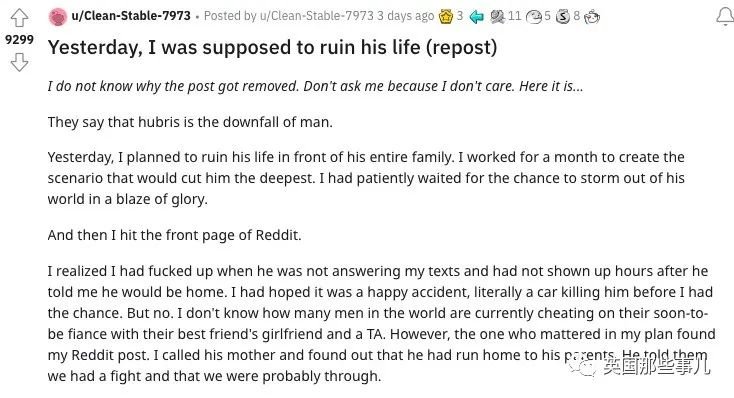 这两天,在reddit板块Truth off my chest(一吐真言)泛起了一则高赞复仇神贴——今天,我将毁掉他的人生。