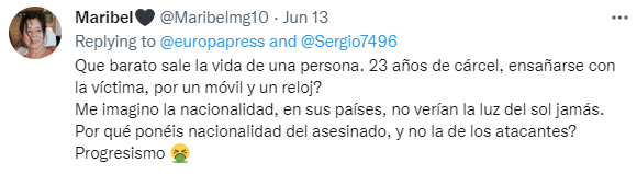 图源:推特@europapress有网友说:“一集体的生命是如许便宜。为了一部手机和一块手表,只用在监狱里待23年,就能对受益者大打出手?”