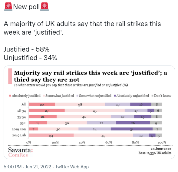 Savanta ComRes 对 2,300 多人进行的一项考察显示,58% 的人表现歇工是公道的。年老人更反对这次歇工。有44%的55 岁及以上的老年人以为歇工公道 ,在18-34 岁的年老人 中有72%以为歇工公道 。五分之三的受访者表现他们广泛反对歇工准则,而只要 35% 的人广泛支持。►这可能仅是全国歇工潮的起头因为通胀高企,工资涨幅跟不上通胀涨幅致使实际支出降落。这类变相降薪在各行各业都存在,这些行业一样会见临一样的困局。这次铁路歇工多是英国将来几个月歇工浪潮的一个起头。Uber 司机要挟要参加大范围歇工。App Drivers & Couriers Union (ADCU)——公家雇佣司机和快递员工会呐喊司机从午夜开始进行 24 小时全国歇工。邮政行业工会(CWU)表现,皇家邮政公司提供的 2% 的加薪“彻底不敷”,将于 6 月 28 日对十一5,000 名皇家邮政员工是不是举办歇工投票,后果下个月发布。老师工会也可能举办歇工。只管在接上去的两年老师会有 5% 的加薪,但全国教育工会曾经去信首相府,要求加薪和通胀程度婚配。