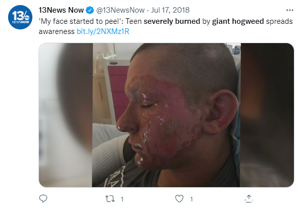 大豕草(学名:Heracleum mantegazzianum),其称号直译自英语的giant hogweed ,是伞形科独活属的一种(英语:monocarpic) 的多年生开花木本动物。据各国环境厅称,巨型猪草,也称为巨型防风草,有一种含有风险毒素的明澈树液。假如人的皮肤接触这些树液,而后袒露在阳光下会被重大烧伤。会泛起极度疼痛的水泡。此前,就有人因此受伤!