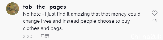 “不是仇富,但只是感觉很巧妙,这些钱足以改动一些人的人生,但他们却选择花在买衣服和包包。”