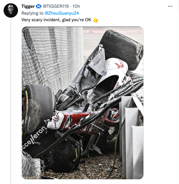 不外好在,周冠宇明天早晨在社交媒体上给大家报了安全,并表现“明天Halo救了我”↓