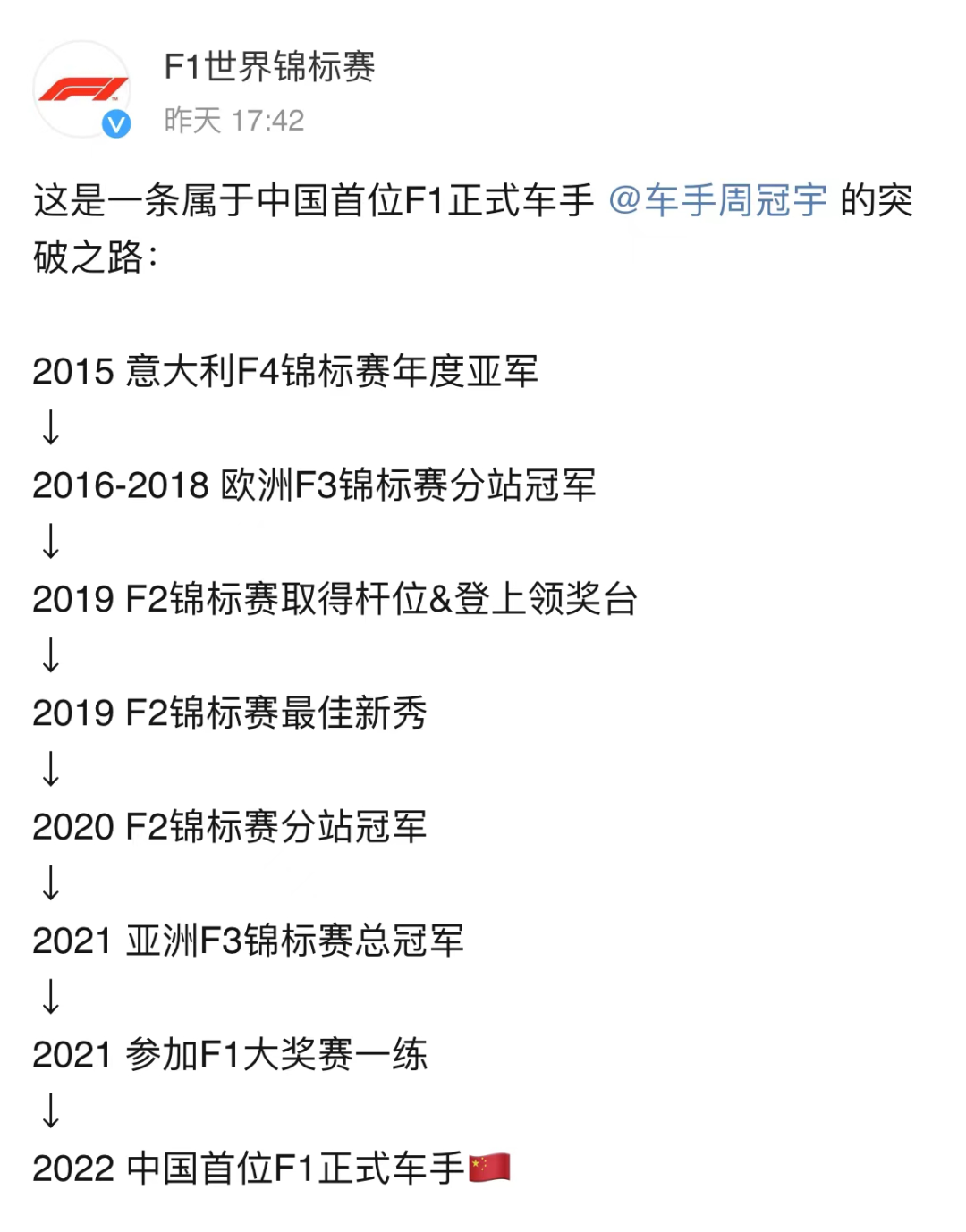 置信大家还对去年那条“发明历史”的旧事有印象吧:去年十一月,阿尔法罗密欧F1车队官宣,中国车手周冠宇正式参加车队,至此,这个二十出头的小伙子,成了中国第一名F1正式车手!