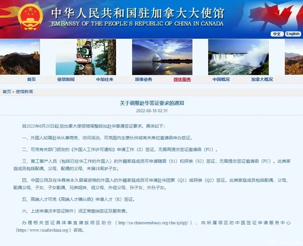而中国驻加拿大大使馆也宣告自6月20号起调剂赴华签证的要求,能够请求团圆或投亲签证。