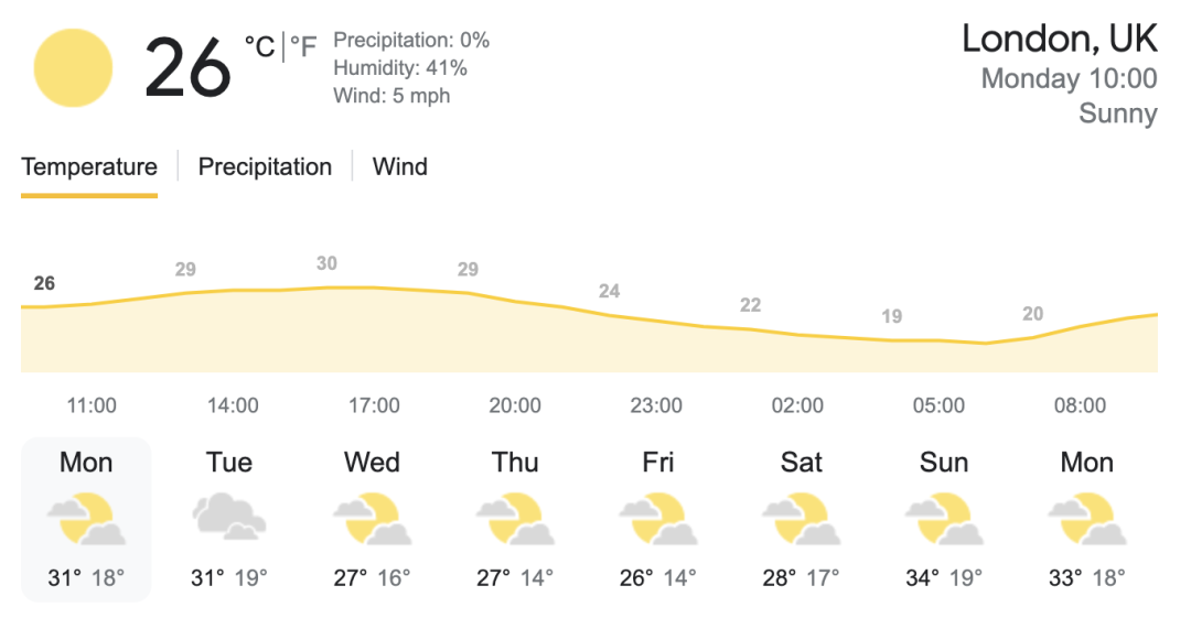 置信大家从周末就感触到热浪了,目前这波热浪将会继续一整周。伦敦本周的温度预计会达到截止目前的全年最高。明天、周二以及周末都是要冲30度的节拍,宝子们一定要多喝水,做好防暑消暑任务!