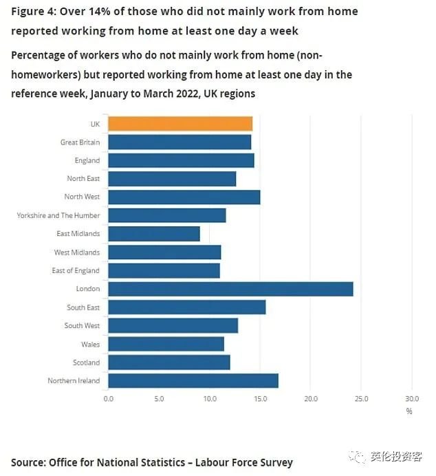 与此同时,全英弹性任务制的比例有所回升。在往年1月至3月期间,有14.3%的不次要在家办公的人士表现,本人每周最少有一天在家办公。这一比例在伦敦最高,为24.3%;在英格兰中东部最低,为9.1%。