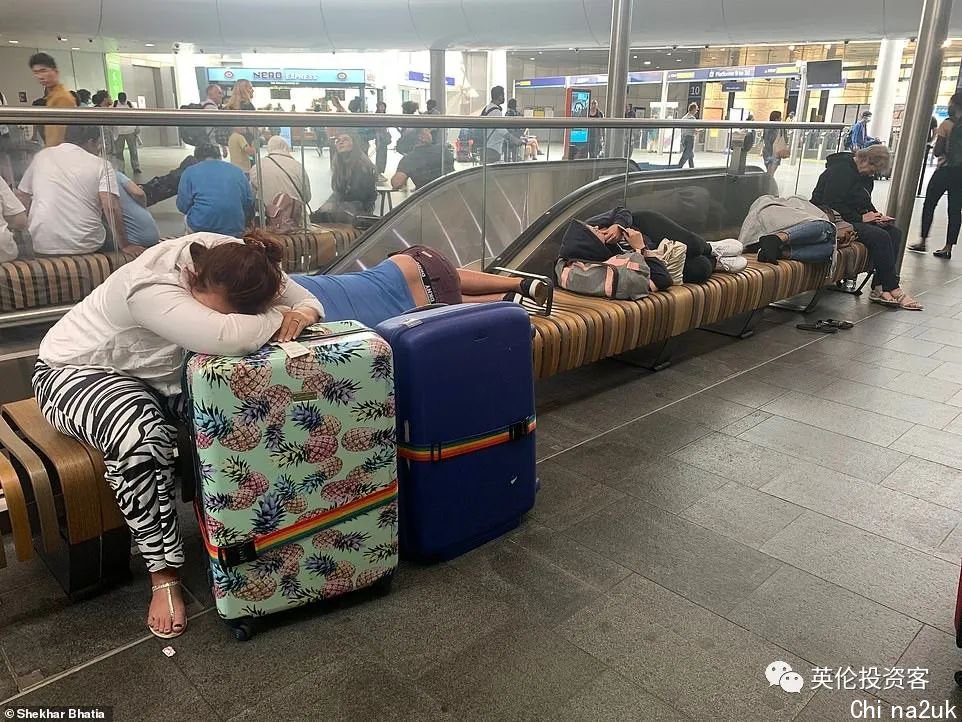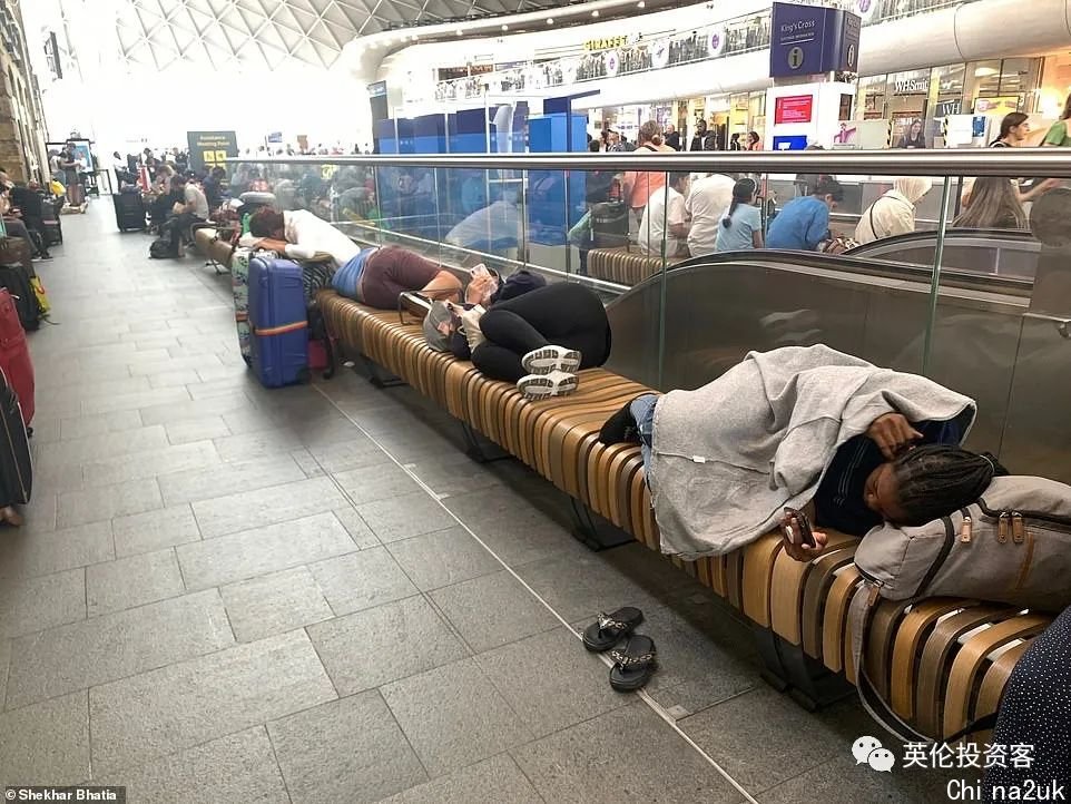 国王十字车站里,一些乘客不胜疲乏在椅子上小憩,无法地等候被推延了的列车。