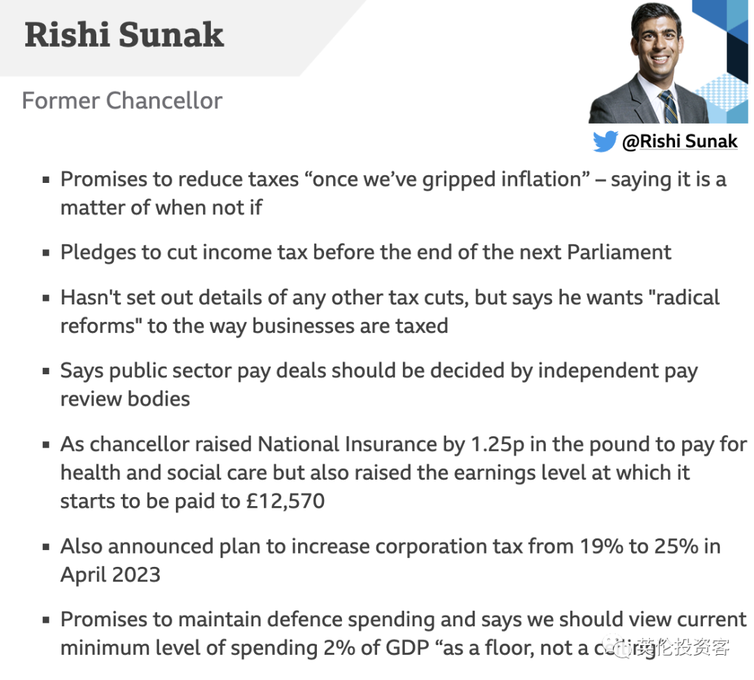 竞选期间,苏纳克和特拉斯次要在经济政策的主意上产生冲突。特拉斯曾许诺,假如她被选,将实行380亿英镑的减税措施,包罗勾销苏纳克负责财相时实行的国民保险税上调以及公司税上调的动作。