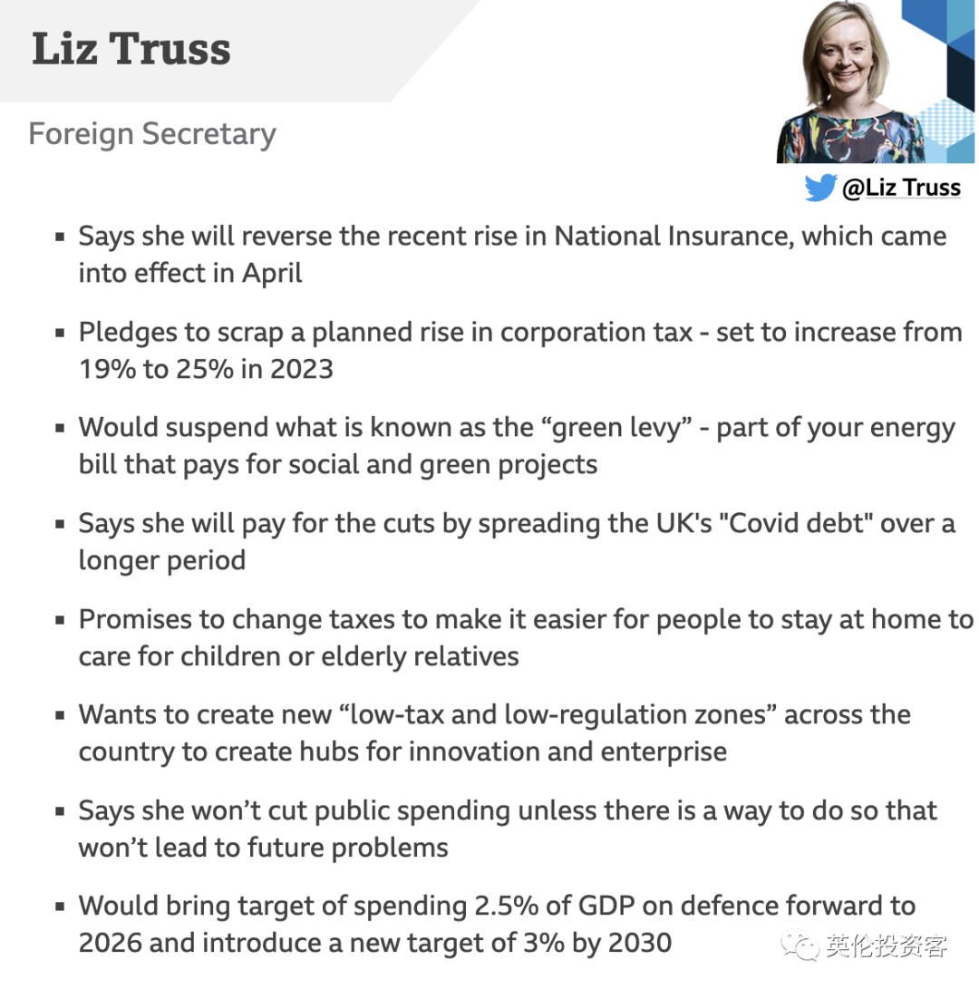 然而,苏纳克称增税是在新冠疫情后修复公共财政的须要措施,同时指摘特拉斯在抛售“坐享其成的经济学”。苏纳克说,本人也但愿能升高民众的税收担负,但那只要在通胀失掉管制之后才会实行。下为BBC最新总结的特拉斯和苏纳克的执政政策。
