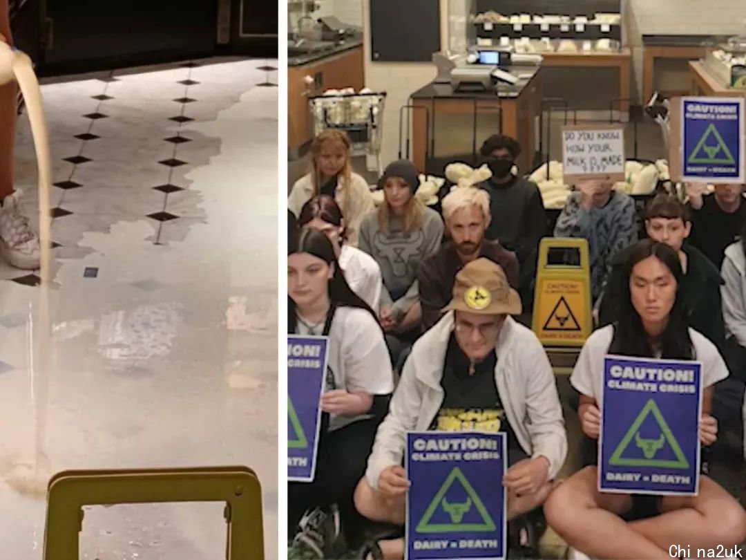 事情产生于上周,来自Animal Rebellion的数名抗议者,把Harrods Food Hall冷柜里的牛奶一瓶瓶倒在了过道的地板上,还在旁边立着“留意!气象危机;乳制品=死亡”的口号立牌。