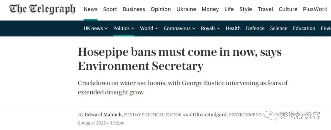 本地时间8月6日,英国环境大臣George Eustice在《逐日电讯报》上撰文表现,一些水务公司推出阻止使用挪动水管的限水令是“正确的”。
