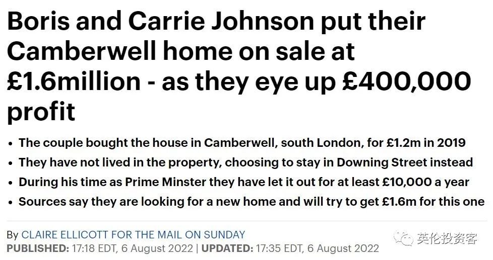 鲍里斯夫妇方案160万英镑发售伦敦房产,3年增值40万英镑