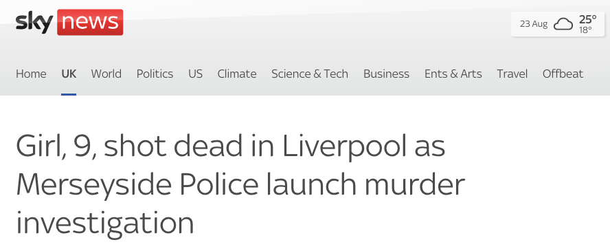 利物浦默西塞德郡产生一同枪杀案,一位9岁女孩胸部中弹而身亡。