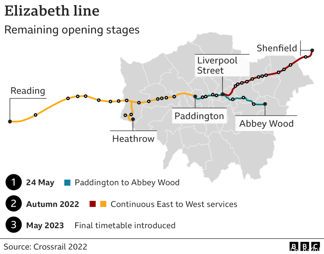 第一阶段:2022年5月24日,曾经启用了伦敦市核心段的10个新车站,衔接Abbey Wood和帕丁顿。
