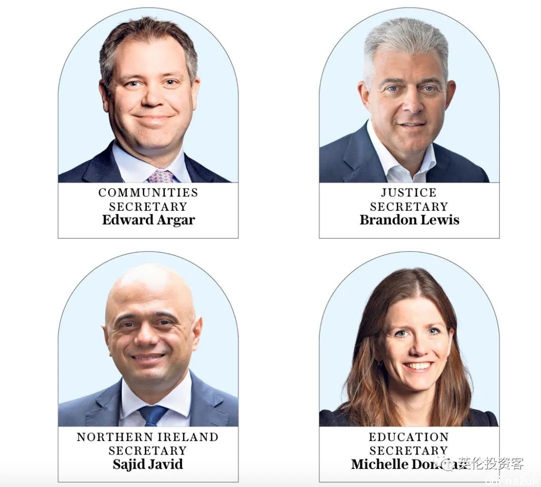 社区大臣Edward Argar、司法大臣Brandon Lewis、北爱尔兰事务大臣贾维德、教育大臣Michelle Donelan。