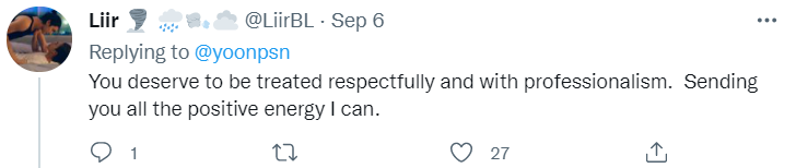 “你值得被尊敬地,专业地看待。但愿我能把一切踊跃的能量发送给你。”