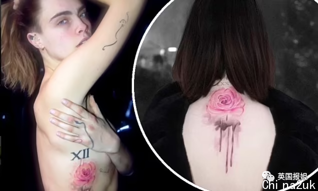 Selena不光在球场上亲了Cara的面颊,还纹了Cara同款玫瑰纹身。