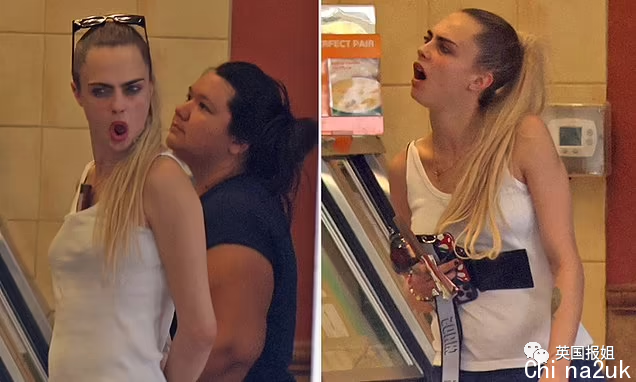 7月Cara在洛杉矶单独买三明治时,显得焦躁易怒,并在店里不断对着空气做鬼脸。