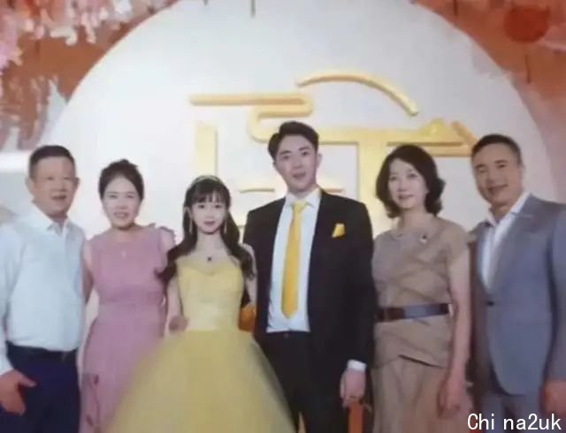 这张合照中,“特步小公主”丁佳敏身穿黄色礼服,微卷的长发散落在肩上,脸上妆容也非常粗劣。她身边的“七匹狼公子”周力源,穿戴黑色西装搭配黄色领带,看起来也是气宇非凡。