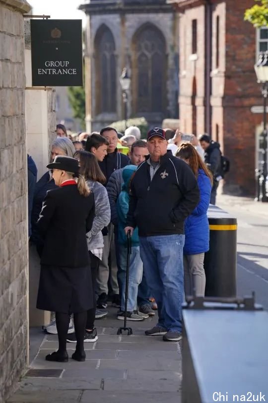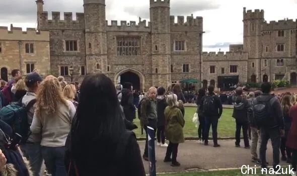 照片显示,早上大约7时30分摆布,已有少量粉丝到达圣乔治教堂外,沿着城堡墙壁排队,等候进入参观女王最初的安歇之地。