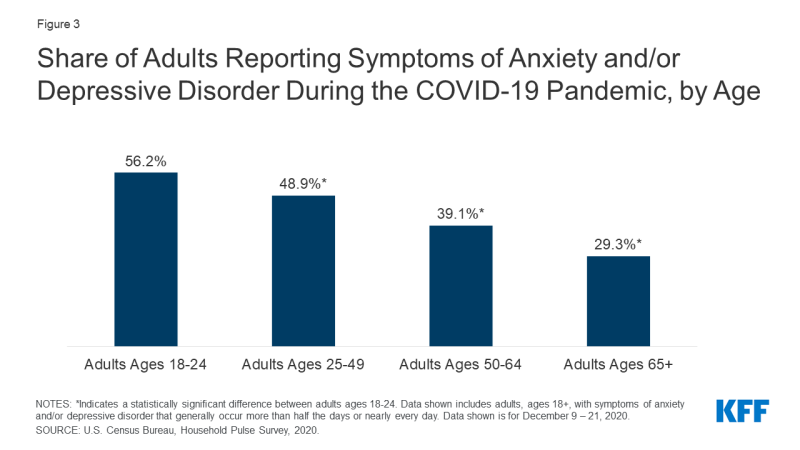 另外一项针对新冠疫情期间,讲演泛起焦虑或抑郁症症状的成年人比例的钻研数据 |图片来源KFF